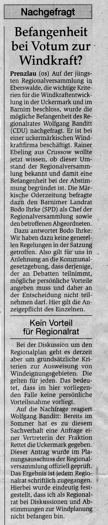 Am 06.02.2012 zur Regionalversammlung in Eberswalde kam die Frage der Befangenheit auf und das sich derjenige der Befangen ist freiwillig melden müsse. Nach meiner Information ist der stimmberechtigte Herr Wolfgang Banditt in der Firma „Enertrag“ beschäftigt.
